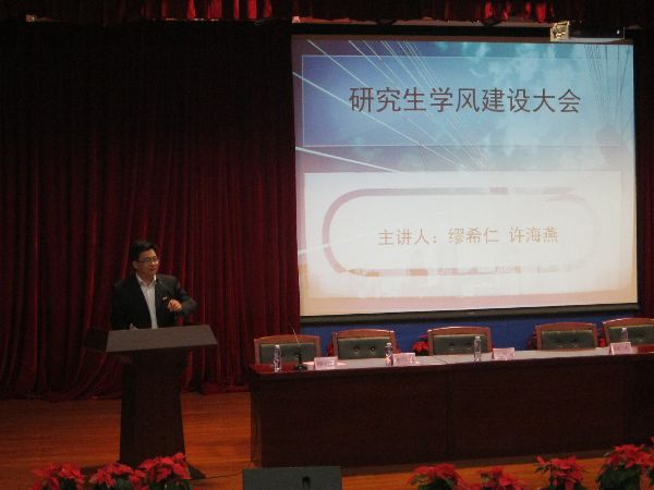 大会伊始,缪希仁教授语重心长地指出,研究生是学术研究的主力军,是创新型国家的建设者,进行科学道德与学风建设是研究生不可缺少的一堂必修课。他以生动的实例鼓励大家要脚踏实地努力投身科研,并希望同学们以发散的思维、昂扬的斗志、敏锐的嗅觉、冒险的精神、前瞻的视角、主导者的心态去发现有价值的新问题,大家从中受益匪浅。接着,许海燕老师充分阐述了研究生学风建设的重要性,指出了学术造假的危害性,她表示,开展学风建设大会,旨在引导研究生遵守学术规范、坚守学术诚信、摒弃学术不端行为,努力成为优良学术道德的践行者和良好学术风气的维护者,学生时代严谨朴实的研究作风,将使大家终身受益。