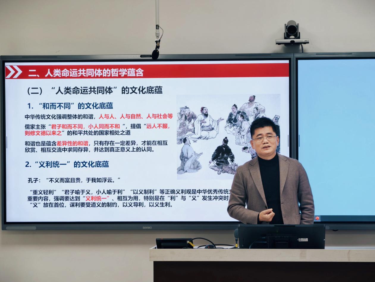 陈永福老师强调,“人类命运共同体”的核心目标是建设持久和平、普遍安全、共同繁荣、开放包容、清洁美丽的世界。他从理论与文化双重维度进行深入剖析:在理论层面,阐释了其深厚的马克思主义哲学基础,包括“历史向世界历史转变”的唯物史观和“真正共同体”的价值追求;在文化层面,挖掘了中华优秀传统文化中“天下为公”“和合共生”等思想精髓,展现了该理念的深厚文化底蕴。