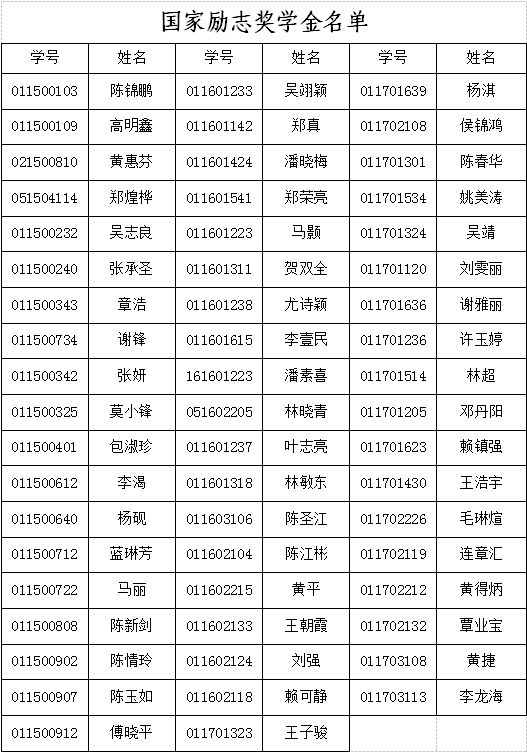 领导研究决定:陈伟睿等4位同学获国家奖学金,陈锦鹏等56位同学获国家励志奖学金,具体名单如下: